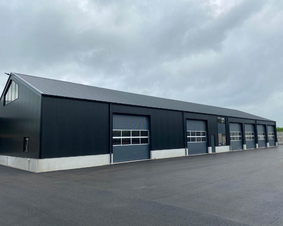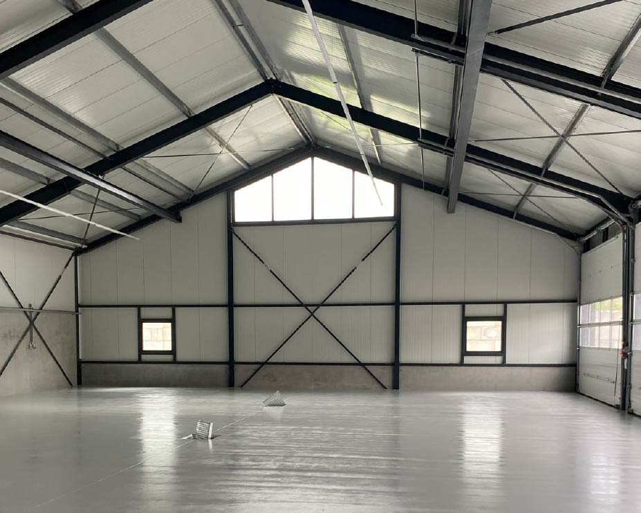 De machineberging bestaat uit twee loodsen met een totale oppervlakte van bijna 1.900 m² en is volledig turnkey opgebouwd – van fundering tot en met dak- en wandafwerking.