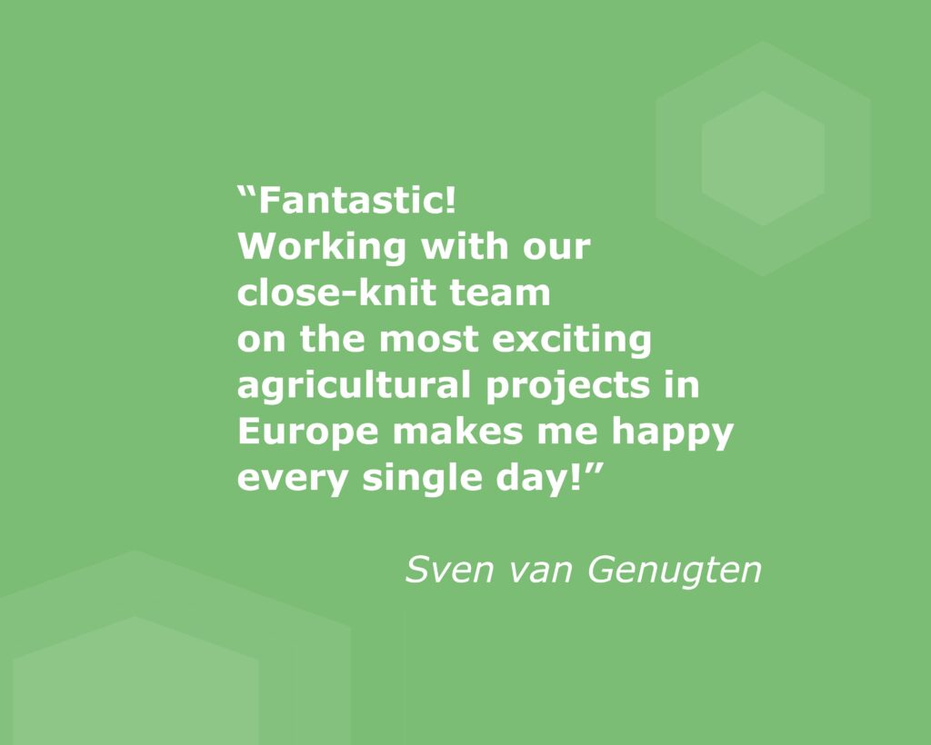 We vroegen hem de volgende zin aan te vullen: Werken bij Genugten Agri is….. Waarop hij als volgt antwoordde: Fantastisch! Met ons hechte team aan de leukste agrarische projecten in Europa werken daar word ik iedere dag weer blij van!